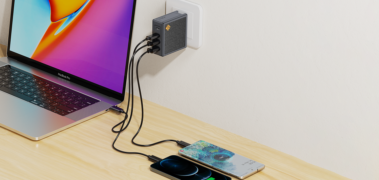 100W Multiport-Ladegerät mit drei USB-C und einem USB-A Anschluss. Ideal für die ganze Familie oder das Büro.