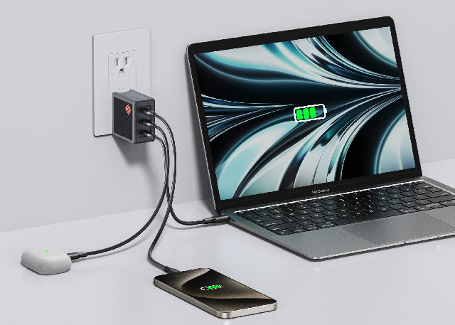 Der 65W Netzadapter verbindet leistungsstarke Performance mit Vielseitigkeit. Bei Nutzung aller drei Anschlüsse liefert der obere Hochgeschwindigkeitsanschluss 45W zum schnellen Laden von M3/M2/M1 MacBooks, während die beiden unteren Anschlüsse jeweils 20W für iPhones bereitstellen.
