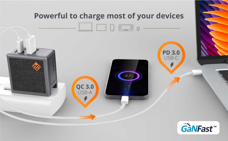 65W GaN-Ladegerät mit USB-C und USB-A Anschluss. Schnellladung für Laptops und Smartphones in einem stylischen Design.