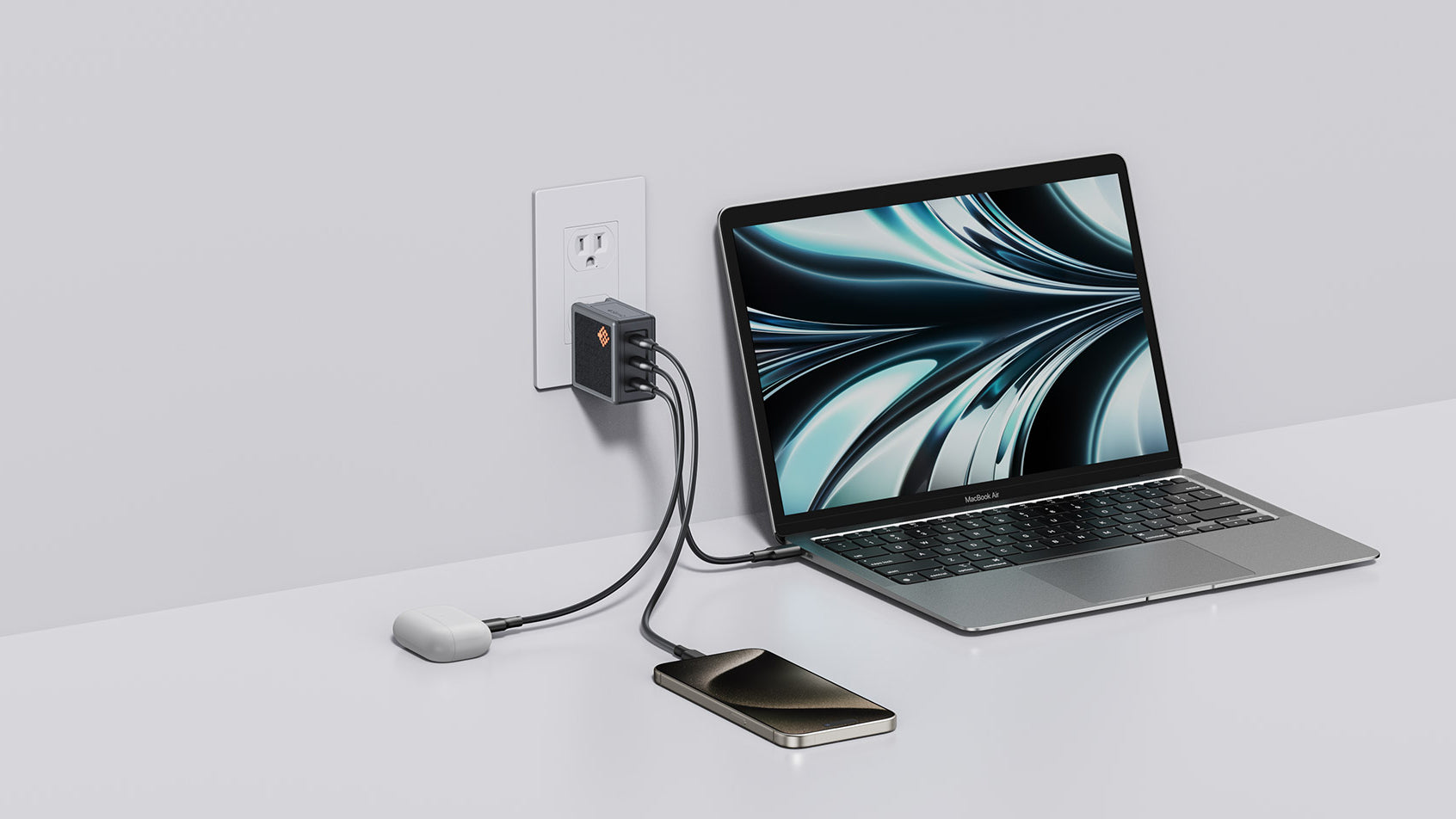 Der 65W Netzadapter verbindet leistungsstarke Performance mit Vielseitigkeit. Bei Nutzung aller drei Anschlüsse liefert der obere Hochgeschwindigkeitsanschluss 45W zum schnellen Laden von M3/M2/M1 MacBooks, während die beiden unteren Anschlüsse jeweils 20W für iPhones bereitstellen.
